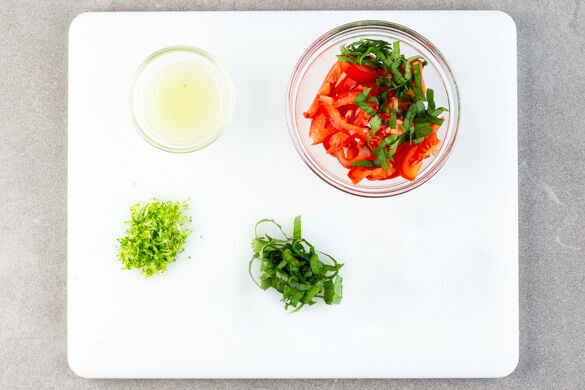 Die Limettenschalen abreiben, dann die Limetten halbieren und auspressen. Die Kräuter samt Stängeln fein schneiden. Die Tomaten in dünne Spalten schneiden und mit der ½ der Kräuter, der ½ des Limettensafts und 2EL Olivenöl vermengen. Die Salsa mit Salz abschmecken.