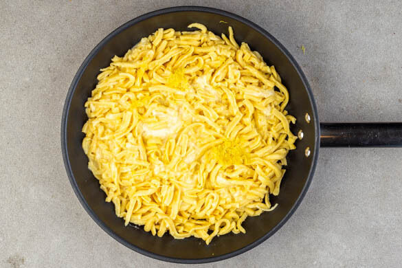 Den Dill samt Stängeln grob schneiden. 5Min. vor Ende der Backzeit die Spätzle, den Käse, das Brühgewürz und 300ml Wasser mit 2EL Olivenöl in der Pfanne bei mittlerer Hitze ca. 5Min. unter ständigem Rühren braten, bis die Spätzle gleichmäßig mit Käsesauce bedeckt sind.