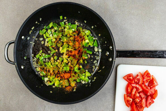 Die Zwiebeln, den Knoblauch, die Paprika und die ½ der Gewürzmischung in einer großen Pfanne mit 2EL Olivenöl bei mittlerer Hitze 5–7Min. anbraten. Inzwischen die Tomaten grob würfeln, mit je 1 Prise Salz und Pfeffer würzen und beiseitestellen.