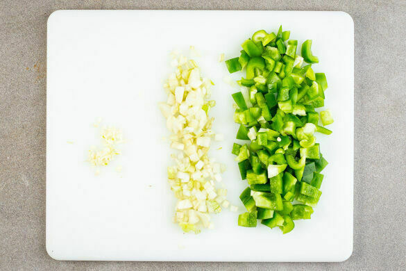 Die Paprika vierteln, entkernen und in 1–2cm große Würfel schneiden. Die Zwiebel schälen, halbieren und grob würfeln. Den Knoblauch schälen und ebenfalls grob würfeln.