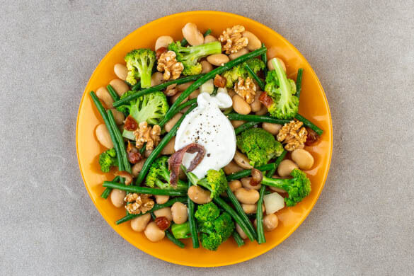 Die Bohnen in einem Sieb mit kaltem Wasser abspülen, abtropfen lassen und zu den grünen Bohnen und dem Brokkoli geben. Das Dressing hinzufügen und alles gut vermengen.