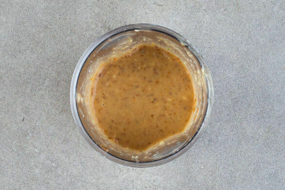 Die restlichen Sardellenfilets samt Öl, den Knoblauch, 3EL Zitronensaft und 1 kräftige Prise Pfeffer zu den Datteln in das hohe Gefäß geben und alles zu einem cremigen Dressing pürieren. Mit Salz abschmecken.