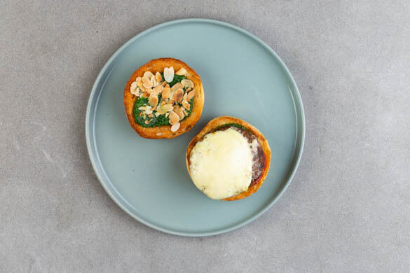Jedes Patty mit 2 Scheiben Mozzarella belegen und mit Salz und Pfeffer würzen. Die Zucchiniwürfel um die Pattys verteilen und alles 2–3Min. abgedeckt braten. Die Brötchen aufschneiden und 3–5Min. im Ofen aufbacken.