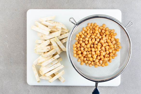 Den Backofen auf 220°C (200°C Umluft) vorheizen. Den Sellerie schälen und in 1–2cm dicke, pommesartige Stifte schneiden. Tipp: Wer den Sellerie mit einem Sparschäler schälen möchte, sollte ihn zunächst halbieren oder vierteln. Die Kichererbsen in einem Sieb mit kaltem Wasser abspülen und abtropfen lassen.