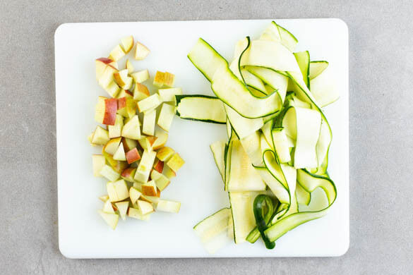 Inzwischen den Apfel vierteln, entkernen und in kleine Würfel schneiden. Die Gurke mit einem Sparschäler rundum in breiten Streifen abschälen.