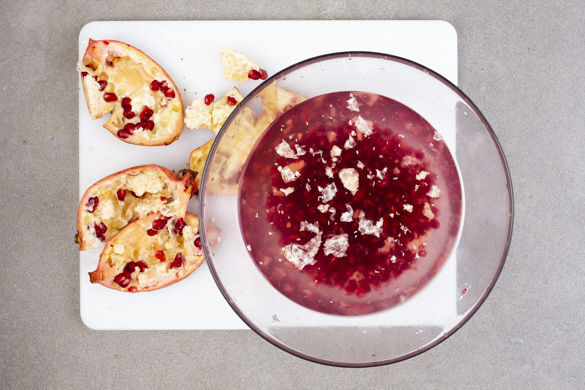 Den Granatapfel halbieren und über einer mit Wasser gefüllten Schüssel aufbrechen. Die Granatapfelkerne unter Wasser aus den Fruchtwänden und Häutchen lösen. Das Pulen im Wasser verhindert, dass sich Granatapfelsaft in der Küche verteilt. Die schwimmenden Häutchen mit einem Löffel abschöpfen, dann die gepulten Granatapfelkerne in ein Sieb abgießen.