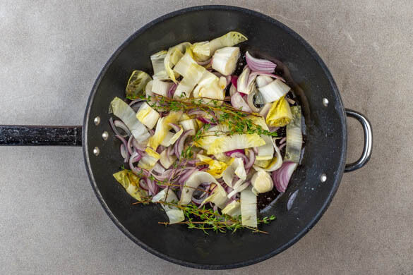 1EL Butter in einer mittelgroßen Pfanne bei mittlerer Hitze schmelzen, dann die Zwiebeln, den Chicorée und die ½ des Thymians hinzugeben und unter gelegentlichem Rühren 10–15Min. braten, bis das Gemüse weich und leicht gebräunt ist. Ggf. etwas Wasser zugeben, um den Bratsatz am Boden der Pfanne zu lösen.