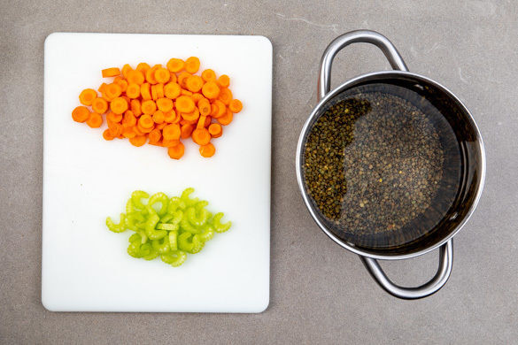 Den Backofen auf 200°C (180°C Umluft) vorheizen. Die Linsen mit 1L Wasser in einen mittelgroßen Topf geben, bei starker Hitze aufkochen lassen und dann bei mittlerer Hitze in 18–20Min. gar kochen. Die Karotte schälen und in feine Scheiben schneiden. Den Sellerie ebenfalls in feine Scheiben schneiden.