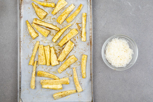Die Pastinakenstücke mit 1EL Olivenöl, ca. 1TL Gewürzmischung und 1 Prise Salz vermengen, auf einem mit Backpapier ausgelegten Backblech verteilen und 15–25Min. im Ofen rösten, bis die Pastinaken leicht gebräunt und gar sind. Währenddessen den Käse fein reiben.