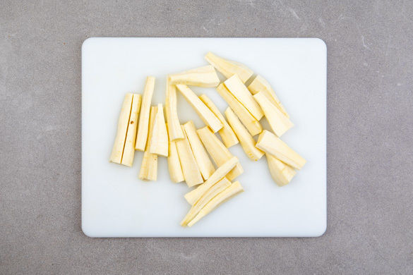 Die Pastinaken schälen und quer halbieren. Die dünneren Hälften längs halbieren, die dickeren Hälften jeweils in 4 pommesartige Stifte schneiden.