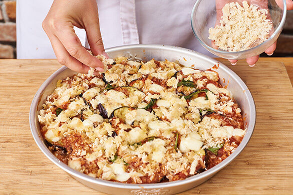 Die restliche Sauce auf den Auberginen verteilen, mit dem restlichen Mozzarella und Hartkäse sowie den Brötchenkrumen bestreuen und die Parmigiana 5–10Min. im Ofen backen, bis der Käse geschmolzen ist und die Brötchenkrumen goldbraun und knusprig sind.