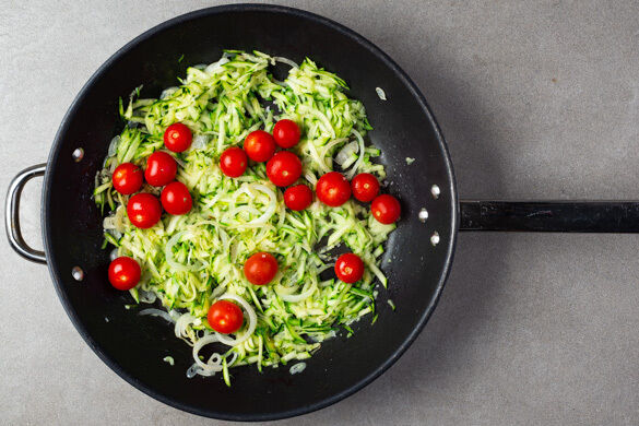 Die Zwiebeln, den Knoblauch, die Zucchini und die Kirschtomaten in einer großen Pfanne mit 1EL Olivenöl und 1 Prise Salz bei mittlerer bis starker Hitze 1–2Min. anbraten.