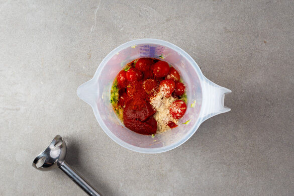 Das fertige Gemüse mit 1TL Paprikapulver, den restlichen Hefeflocken und der ½ des Tomatenmarks vermengen und in einem hohen Gefäß mit einem Stabmixer fein pürieren. Die Sauce ggf. mit etwas Kochwasser verdünnen und mit Salz und Pfeffer abschmecken. Die Gnocchi mit der Sauce anrichten und mit dem Rosmarin-Mandel-Topping garniert servieren.