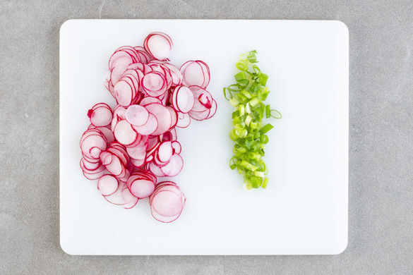 Die Radieschen in hauchdünne Scheiben schneiden oder hobeln. Die Lauchzwiebeln in feine Ringe schneiden. 2TL Brühgewürz in 200ml heißem Wasser auflösen.
