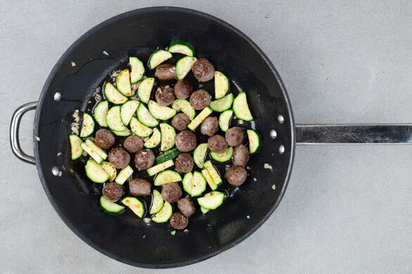 Den Knoblauch in einer großen Pfanne mit 1EL Olivenöl bei mittlerer Hitze ca. 30Sek. anbraten. Die Chorizoscheiben dazugeben und 1–2Min. mitbraten, dann die Zucchini mit 1 Prise Salz in die Pfanne geben und ca. 3Min. anbraten.