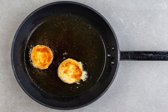 Eine mittelgroße Pfanne ca. 0,5cm hoch mit Pflanzenöl befüllen und dieses bei mittlerer Hitze erwärmen. Die Camemberts im heißen Öl auf jeder Seite 3–4Min. ausbacken, bis sie goldbraun und weich sind.