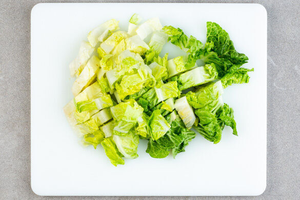 Den Backofen mit Grillfunktion oder Ober-/Unterhitze auf 250°C vorheizen. Den Salat längs halbieren, dann quer in mundgerechte Streifen schneiden, dabei den Strunk entfernen.