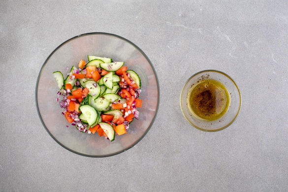 1EL Olivenöl mit 2TL Essig und je 1 Prise Salz und Pfeffer zu einem Dressing verrühren und mit den Tomaten, den Gurkenscheiben und den Zwiebeln vermengen. Tipp: Wer keine rohen Zwiebeln mag, kann diese vorher in einer kleinen Pfanne bei mittlerer Hitze mit 2EL Wasser 2–3Min. andünsten.