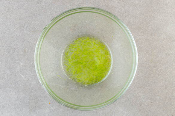Die Limettenschale abreiben, dann die Limette halbieren und auspressen. In einer großen Schüssel den Limettensaft mit 1EL Pflanzenöl, 1EL hellem Essig, 1½TL Zucker und ½TL Salz verrühren, bis Zucker und Salz auflösen.