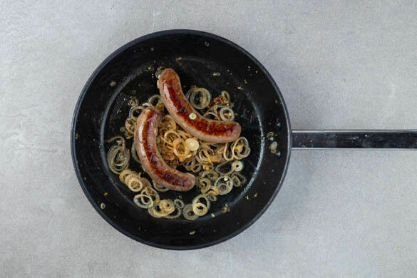 Die Würste und die Zwiebelringe in einer großen Pfanne mit 2EL Pflanzenöl bei starker Hitze 3–4Min. anbraten, dabei gelegentlich wenden.