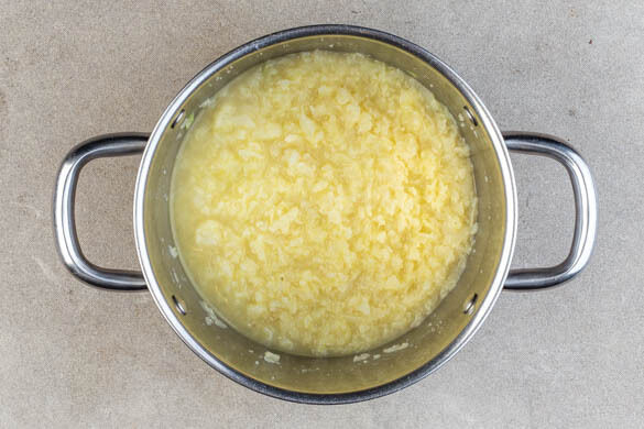 Den Knoblauch schälen und grob würfeln. Mit dem Blumenkohlreis, 2EL Olivenöl, dem Brühgewürz, ½TL Salz und 1 kräftigen Prise Pfeffer in einen großen Topf geben. 800ml Wasser angießen und alles abgedeckt bei mittlerer Hitze aufkochen, dann 8–10Min. bei mittlerer bis niedriger Hitze sanft köcheln lassen, bis der Blumenkohlreis gar ist.