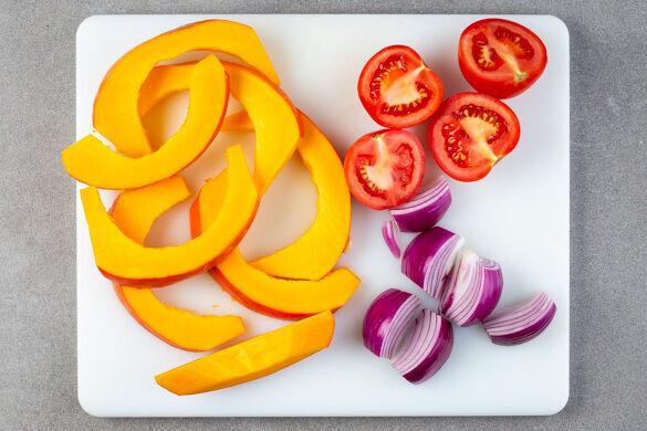 Den Backofen auf 220°C (200°C Umluft) vorheizen. Den Kürbis halbieren, entkernen und in ca. 1cm breite Spalten schneiden. Die Tomaten halbieren. Die Zwiebel schälen, halbieren und jede Hälfte in 3 Spalten schneiden.