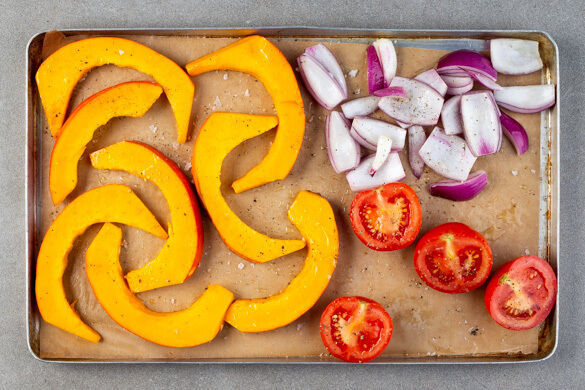 Den Backofen auf 220°C (200°C Umluft) vorheizen. Die Kürbisse halbieren, entkernen und in ca. 1cm breite Spalten schneiden. Die Tomaten halbieren. Die Zwiebeln schälen, halbieren und jede Hälfte in 3 Spalten schneiden.