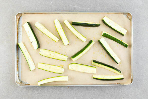 Den Backofen auf 240°C (220°C Umluft) vorheizen. In einem mittelgroßen Topf 1L Wasser für die Kartoffeln zum Kochen bringen. Die Zucchini der Länge nach in pommesartige Stifte schneiden. Auf einem mit Backpapier ausgelegten Backblech mit 2EL Olivenöl, der Gewürzmischung, ½TL Salz und 1 kräftigen Prise Pfeffer vermengen und 15–20Min. im Ofen backen.