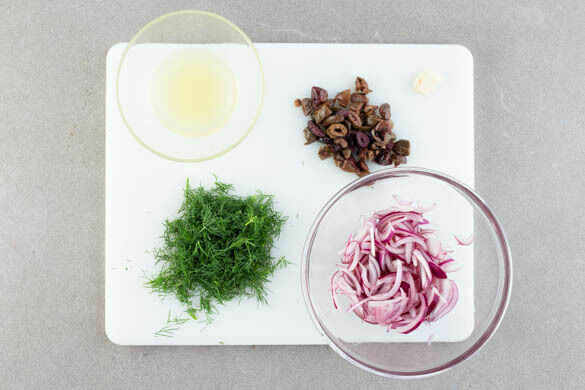 Die Zitronen halbieren und auspressen. Die Zwiebel schälen, halbieren und in feine Streifen schneiden, dann mit 1EL Zitronensaft, 1TL Essig und je 1 kräftigen Prise Salz und Zucker vermengen und beiseitestellen. Die Dillspitzen abzupfen und grob schneiden. Die Oliven grob hacken oder in Ringe schneiden. Den Knoblauch schälen.