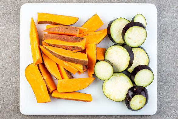Den Backofen auf 240°C (220°C Umluft) vorheizen. Die Süßkartoffeln samt Schale in 1–2cm dicke Stifte oder Spalten schneiden. Die Aubergine in ca. 2cm dicke Scheiben schneiden, ggf. vorher längs halbieren.