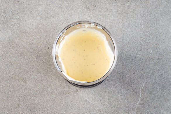 Den Feta mit den Fingern oder einer Gabel grob zerkrümeln und in einem hohen Gefäß mit der ½ der Crème fraîche und 1 Prise Chiliflocken zu einer glatten Creme pürieren, dabei ggf. esslöffelweise etwas Wasser zugeben. Mit Salz und ggf. mehr Chili abschmecken, jedoch etwas Chili für die Pitachips aufbewahren.