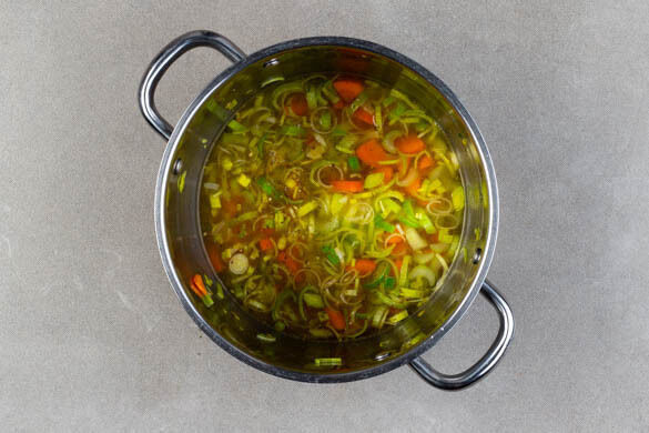 Das Brühgewürz und die Gewürzmischung mit 1,2L warmem Wasser hinzufügen und aufkochen lassen. Die Suppe 13–15Min. köcheln lassen, bis das Gemüse gar ist.