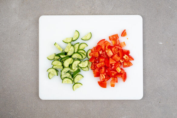 Die Gurke längs halbieren und in dünne Scheiben schneiden. Die Tomaten in kleine Würfel schneiden. Den Bulgur auf Teller verteilen. Die Gurken, die Tomaten, die Karotten, den Rotkohl und die Falafeln darauf anrichten und mit der Joghurtsauce beträufelt servieren.