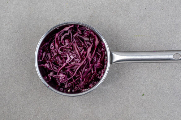 Den Rotkohl in feine Streifen schneiden. Die Zwiebel schälen und fein würfeln, dann mit 3EL Essig, 2EL Wasser, 1TL Zucker und 1 kräftigen Prise Salz in einem kleinen Topf aufkochen. Den Herd ausschalten, sobald der Sud kocht, dann den Rotkohl unterrühren und den Sud mit Pfeffer abschmecken.