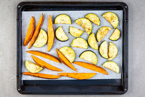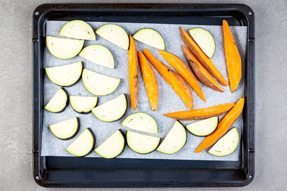 Den Backofen auf 220°C (200°C Umluft) vorheizen. Die Süßkartoffeln samt Schale längs halbieren und in ca. 1cm dicke Spalten schneiden. Die Auberginen längs halbieren und in ca. 0,5cm dicke Scheiben schneiden. Das Gemüse auf zwei mit Backpapier ausgelegte Backbleche geben.