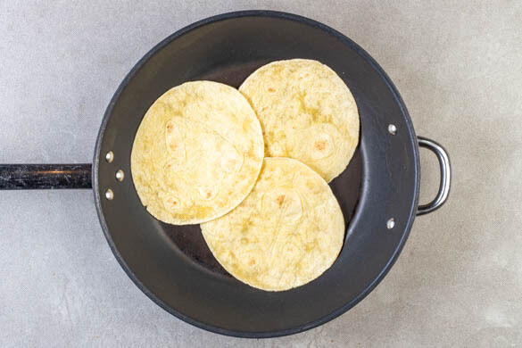 In a medium-sized pan on medium heat, warm the tortillas in batches for 15–20sec. on each side, without adding oil. Keep warm covered on a plate.