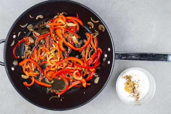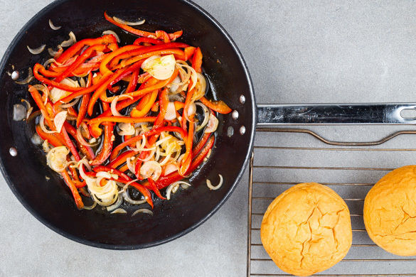 Die Paprika, die Zwiebeln und den Knoblauch in einer großen Pfanne mit 1EL Pflanzenöl, 4EL Wasser, 1TL Essig, 1TL Zucker, 1/2TL Salz und 1 Prise Pfeffer bei starker Hitze ca. 1Min. anbraten, dann abgedeckt bei mittlerer Hitze ca. 10Min. sanft köcheln lassen, bis das Gemüse weich ist. Die Burgerbrötchen 4–5Min. im Ofen aufbacken.