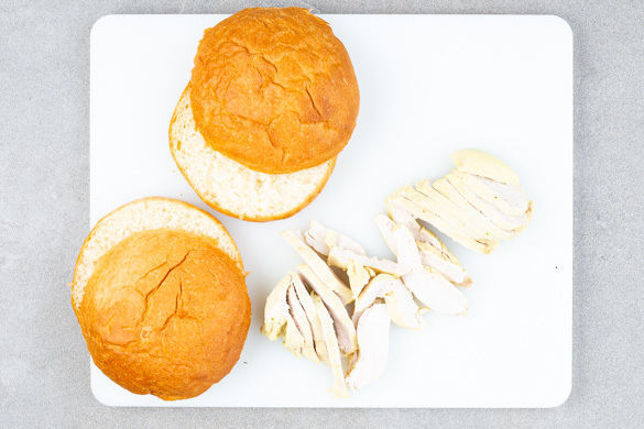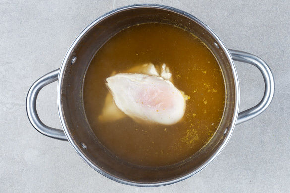 In einem kleinen Topf 500ml Wasser zum Kochen bringen. Das Fleisch mit etwas Küchenkrepp trocken tupfen und längs halbieren. Die 1/2 des Brühgewürzes im kochenden Wasser auflösen, dann das Fleisch hineingeben und abgedeckt bei mittlerer Hitze 6–8Min. garen. Aus der Brühe nehmen und auf einem Teller abkühlen lassen.