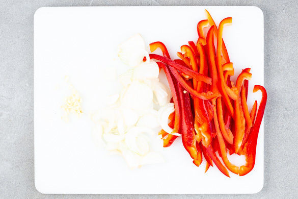 Den Backofen auf 200°C Umluft (220°C Ober-/Unterhitze) vorheizen. Die Paprika vierteln, entkernen und in dünne Streifen schneiden. Die Zwiebel schälen, halbieren und in feine Streifen schneiden. Den Knoblauch schälen und fein würfeln.