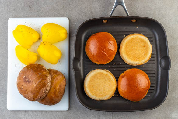 Eine Grillpfanne stark erhitzen oder den Grill vorbereiten. Die Burgerbrötchen aufschneiden und 2–3Min. anrösten. Die Paprika vierteln und entkernen. Falls vorhanden, die Stiele der Pilze entfernen. Die Paprika und die Pilzhüte mit 1EL Olivenöl einpinseln und mit 1 kräftigen Prise Salz und Pfeffer würzen.