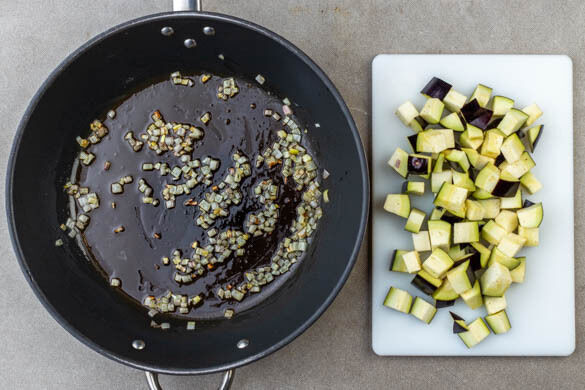 Die Schalotte schälen und grob würfeln. In einer großen Pfanne mit 2EL Olivenöl bei mittlerer Hitze unter gelegentlichem Rühren 6–8Min. braten, bis die Schalotten weich und leicht gebräunt sind. Inzwischen die Aubergine in ca. 2cm große Würfel schneiden. Die Schalotten mit einer Schaumkelle aus der Pfanne nehmen und beiseitestellen, dabei möglichst viel Öl in der Pfanne lassen.