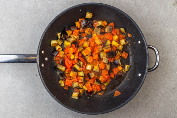 Die Auberginenwürfel in die Pfanne geben und bei mittlerer Hitze 5–7Min. braten, bis sie leicht gebräunt sind. Die Tomaten grob würfeln, mit 50ml Wasser in die Pfanne geben und abgedeckt 4–6Min. garen, bis die Auberginen weich sind. Die Auberginenmischung aus der Pfanne nehmen und zu den Schalotten geben. Die Pfanne wird weiterverwendet.