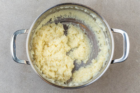 In einem mittelgroßen Topf 300ml leicht gesalzenes Wasser zum Kochen bringen. Den Blumenkohl in kleinere Röschen zerteilen und direkt in den Topf geben. Sobald das Wasser kocht, die Hitze reduzieren und unter gelegentlichem Rühren 10–12Min. köcheln lassen, bis der Blumenkohl sehr weich ist. Vom Herd nehmen und abgedeckt beiseitestellen.