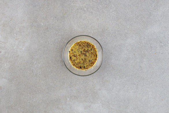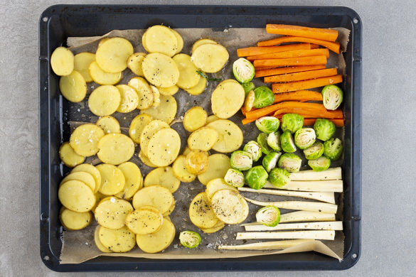 Den Rosenkohl, die Kartoffeln, die Karotten und die Pastinaken auf ein mit Backpapier ausgelegtes Backblech geben und mit 3EL Olivenöl, der Gewürzmischung und je 1 kräftigen Prise Salz und Pfeffer gut vermengen. Das Gemüse gleichmäßig verteilen und im Ofen ca. 20Min. rösten. Zwischendurch einmal wenden.