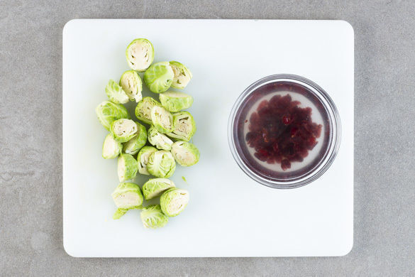 Den Backofen auf 210°C (190°C Umluft) vorheizen. Vom Rosenkohl den Strunk abschneiden und die äußeren Blättern entfernen. Die Rosenkohlröschen halbieren. Die Cranberrys in 100ml lauwarmem Wasser ca. 10Min. einweichen, dann über einem Sieb abtropfen lassen, das Einweichwasser dabei auffangen.