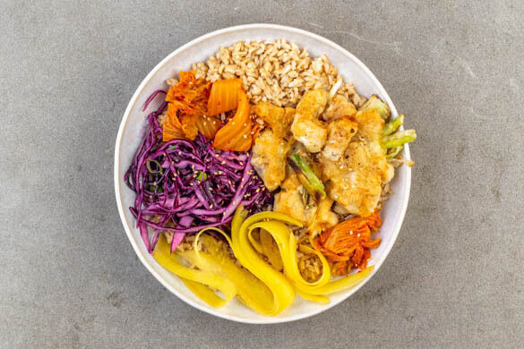 Knusprige Alaska-Seelachs-Reis-Bowl mit Kimchi und Rotkohl-Slaw