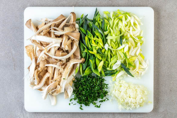Die Austernpilze in grobe Streifen zupfen. Den Lauch der Länge nach halbieren und schräg in feine Streifen schneiden. Die Zwiebel schälen, halbieren und fein würfeln. Die Petersilie samt Stängeln fein hacken.