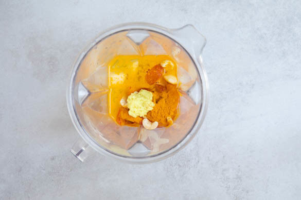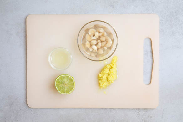 Die Cashews in 100ml warmem Wasser einweichen. Vor dem Pürieren abgießen. Den Ingwer schälen und fein reiben. Die Limette halbieren und auspressen.