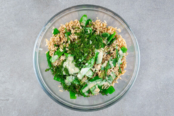 Die Dill fein schneiden und mit dem Sellerie-Reis und dem Dressing vermengen. Den Thunfisch gut abtropfen lassen.