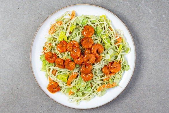 Die Nudeln auf tiefe Tellern verteilen, mit den Garnelen anrichten und nach Belieben mit dem restlichen Limettensaft beträufelt servieren.